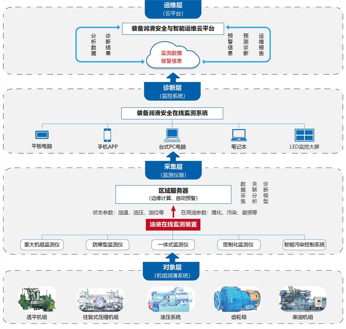 油液在線監(jiān)測(cè)系統(tǒng)(OMS)是集“多傳感器集成和軟件平臺(tái)開發(fā)”為一體的設(shè)備潤(rùn)滑安全監(jiān)測(cè)綜合性預(yù)警產(chǎn)品(企業(yè)裝備油液在線監(jiān)測(cè)與故障預(yù)警系統(tǒng)),能實(shí)時(shí)監(jiān)測(cè)裝備在用油液的劣化、污染及部件的磨損狀態(tài)變化,有效預(yù)防裝備的重大潤(rùn)滑磨損事故,提高企業(yè)裝備的可靠性,助力企業(yè)裝備智能遠(yuǎn)程運(yùn)維。該系統(tǒng)主要由硬件系統(tǒng)和軟件系統(tǒng)等組成,硬件系統(tǒng)包括主傳感器(粘度傳感器、水分傳感器、污染顆粒傳感器、鐵磁磨粒傳感器、密度傳感器、油品品質(zhì)傳感器、溫度傳感器)、傳感器接口模塊、數(shù)據(jù)采集卡、電源、工控機(jī)、通訊系統(tǒng)等,軟件系統(tǒng)分為工控機(jī)版本、局域網(wǎng)版本、互聯(lián)網(wǎng)版本等。